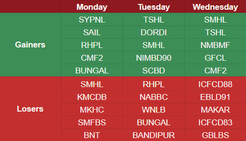 This week, the hydropower sector dominated the gains. Notable performers include Super Madi Hydropower Limited (SMHL), which appeared as a gainer on Tuesday and Wednesday. Alongside this, Three-star Hydropower Limited (TSHL), Dordi Khola Hydropower Limited (DORDI), and Rashuwagadhi Hydropower Company Limited (RHPL).