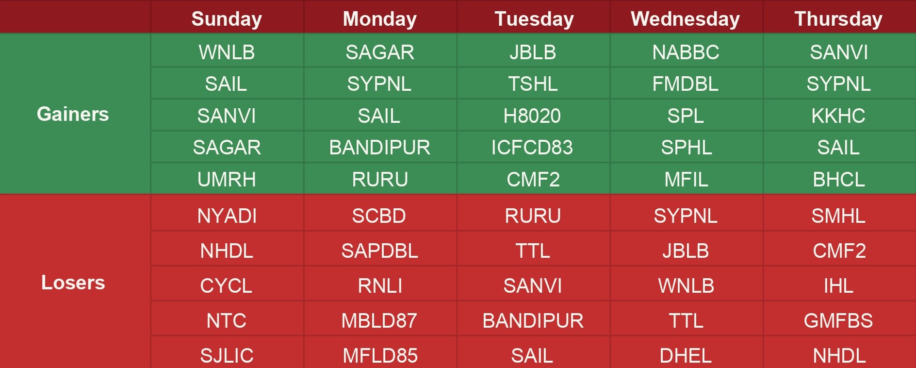 On the losing side, SY Panel Nepal (SYPNL), which repeatedly appeared on the list of top gainers, slipped to the list of underperformers on Wednesday. Other stocks, such as WNLB, SAIL, SANVI, and RURU, that appeared on the gainers' list, also appeared on the list of underperforming stocks.