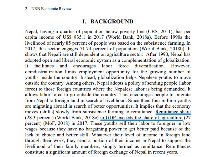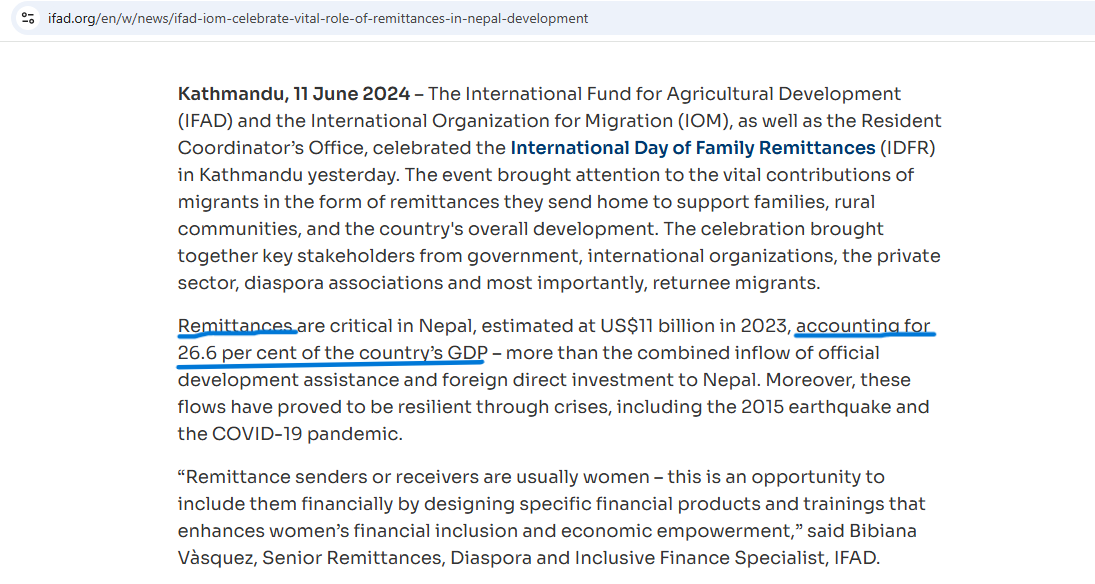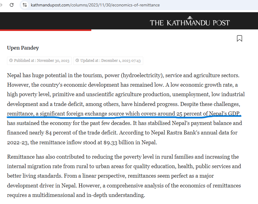 Similarly, Youtuber Binayak Kuikel made a similar reference when discussing remittance in his vlog episode — Remittance is NOT helping!! while citing an article published in The Kathmandu Post that too made the same reference [image below].