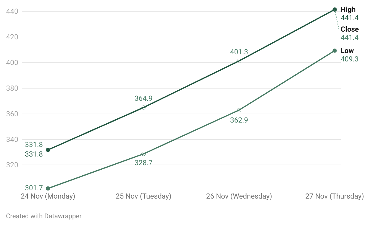 From 331.8 on November 24, SAIL surged to 441.4 on November 27 — a 32.8% rise within four trading days. Turnover expanded from NRs 81.7 lakh on November 24 to NRs 2.15 crore.